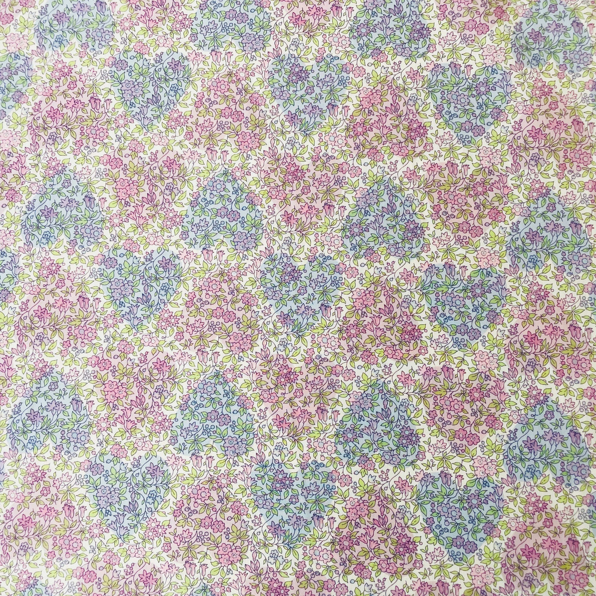 Using the beloved Chamomile print as a floral backdrop, this whimsical rendition introduces transparent, alternating hearts for a playful touch. Comprising of tiny berries and simplified trailing flowers including forget-me-nots, daisies, and bluebells, this quintessential Liberty botanical finds its roots in an archival 1950s pattern.