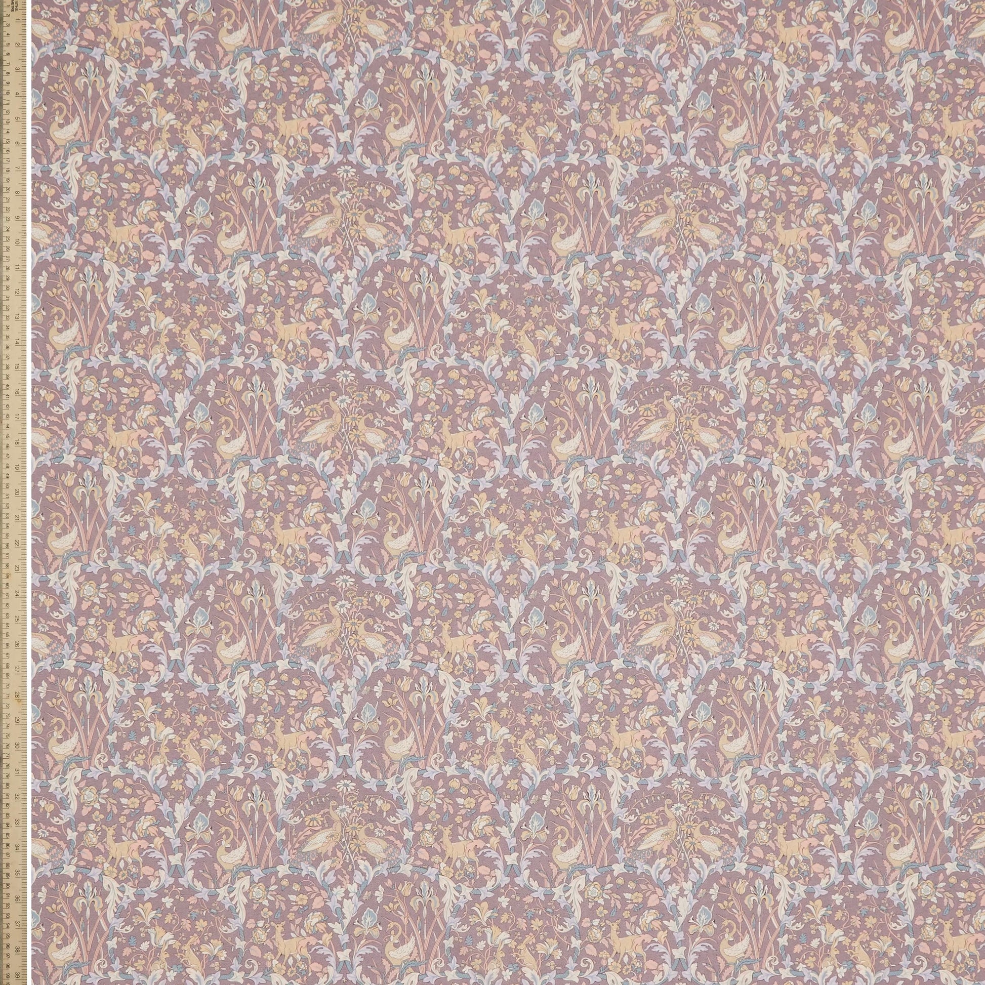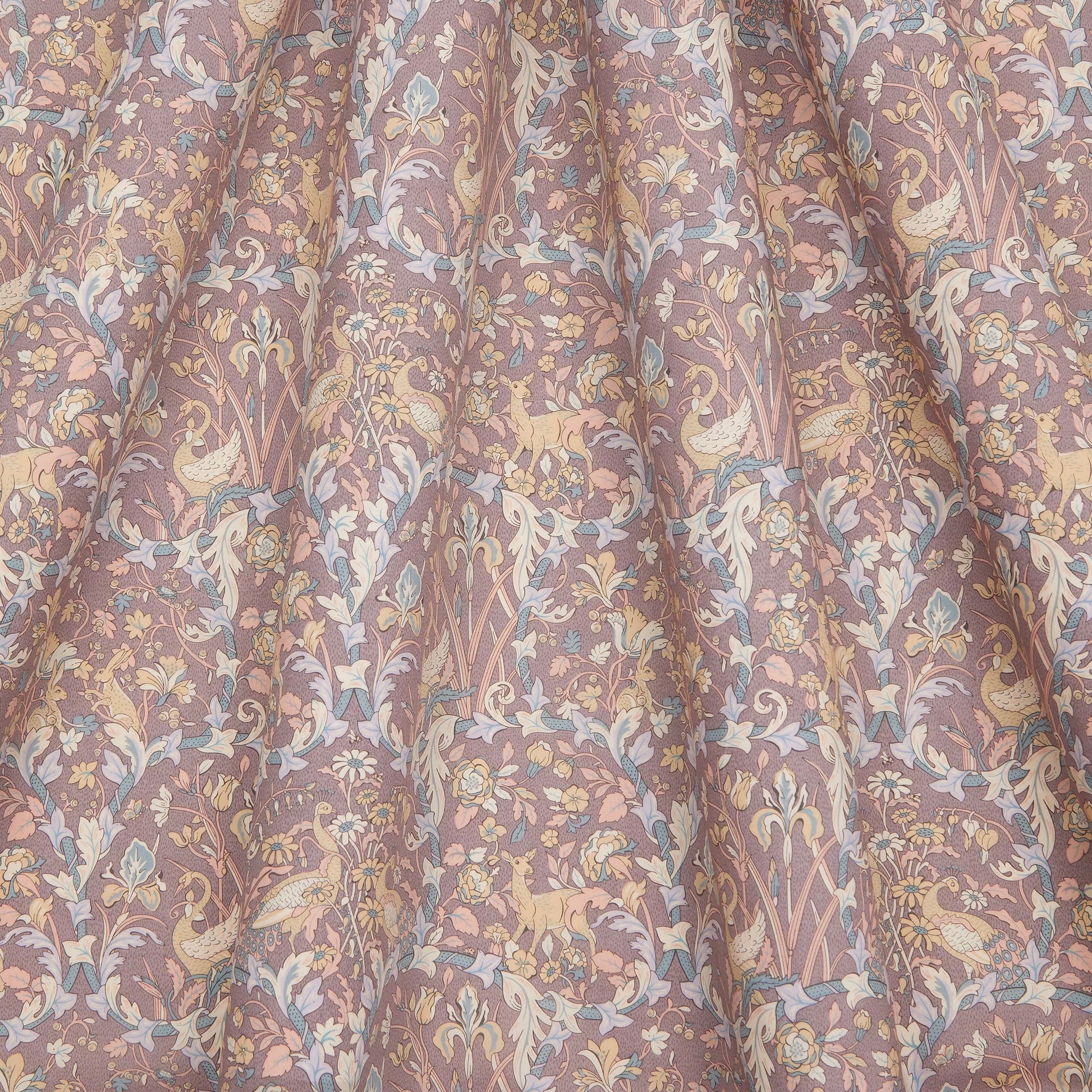 Hand-painted in the Liberty studio, Joan tells a poignant story of collaboration across generations. This Arts & Crafts style conversational is a modern iteration of Walter Crane’s timeless ‘The Four Seasons’ textile pattern. Looking through four vignettes framed by trailing ivy, each floral scene symbolises a distinct season, teeming with nature’s wonders. Amidst delicate roses, bluebells, tulips, daisies and irises, one discovers a lively cast of characters: peacocks, butterflies, swans, hares, frogs, bees, and deer. This print is part of the second chapter of this collection, Collaboration, which reflects the current design team’s celebration of the techniques and styles of their predecessors - bridging the gap between past and present.