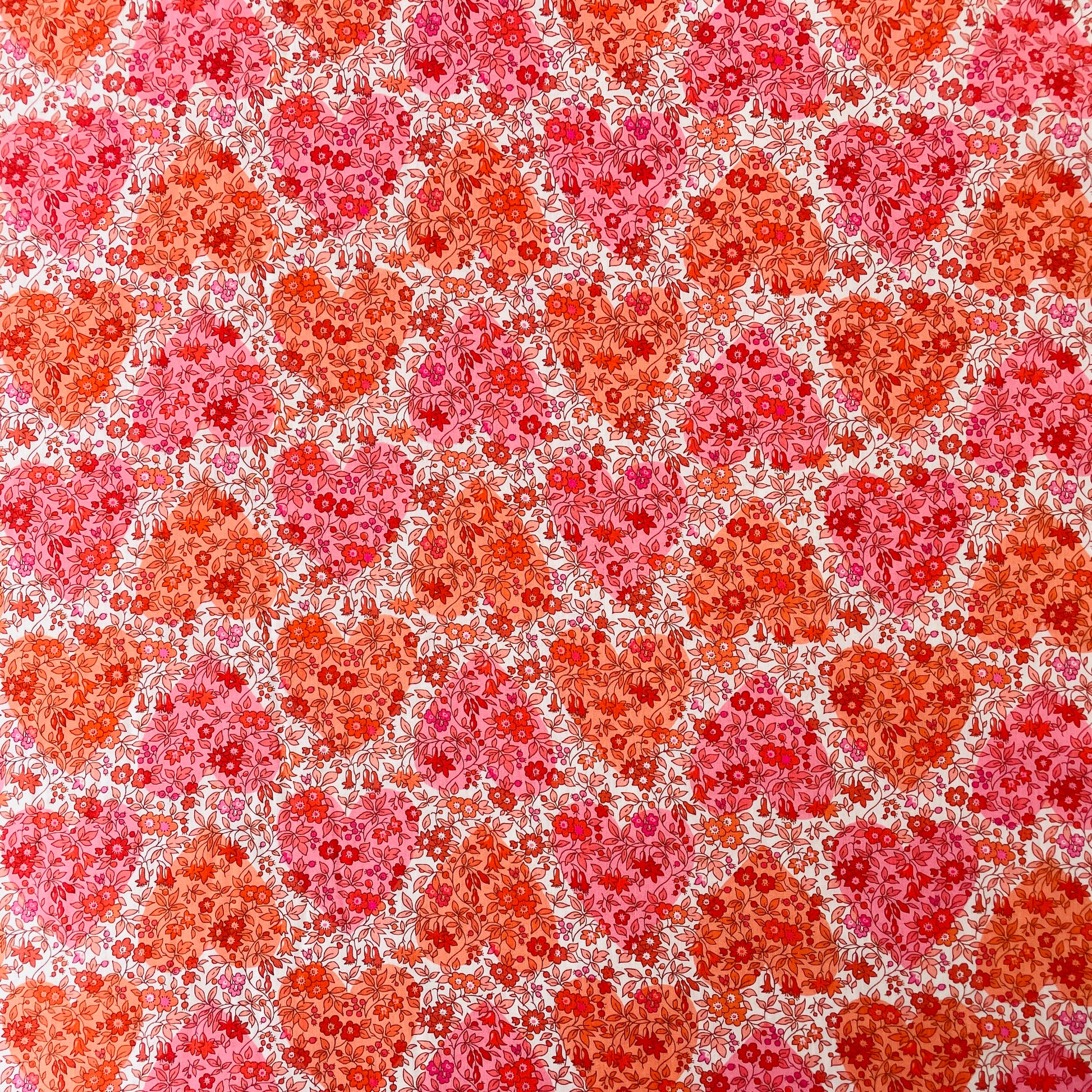 Using the beloved Chamomile print as a floral backdrop, this whimsical rendition introduces transparent, alternating hearts for a playful touch. Comprising of tiny berries and simplified trailing flowers including forget-me-nots, daisies, and bluebells, this quintessential Liberty botanical finds its roots in an archival 1950s pattern.
