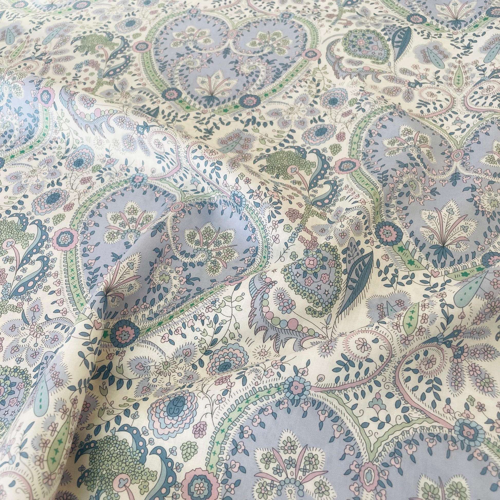 Theri Kitty showcases an intricate paisley design, adorned with beautifully embellished heart-shaped motifs and surrounded by drifting tendrils and delicately stylized flowers. Inspired by a 19th-century artwork from the Liberty archive, this charming print was meticulously redrawn and recoloured in soft yet refreshing colour palettes.