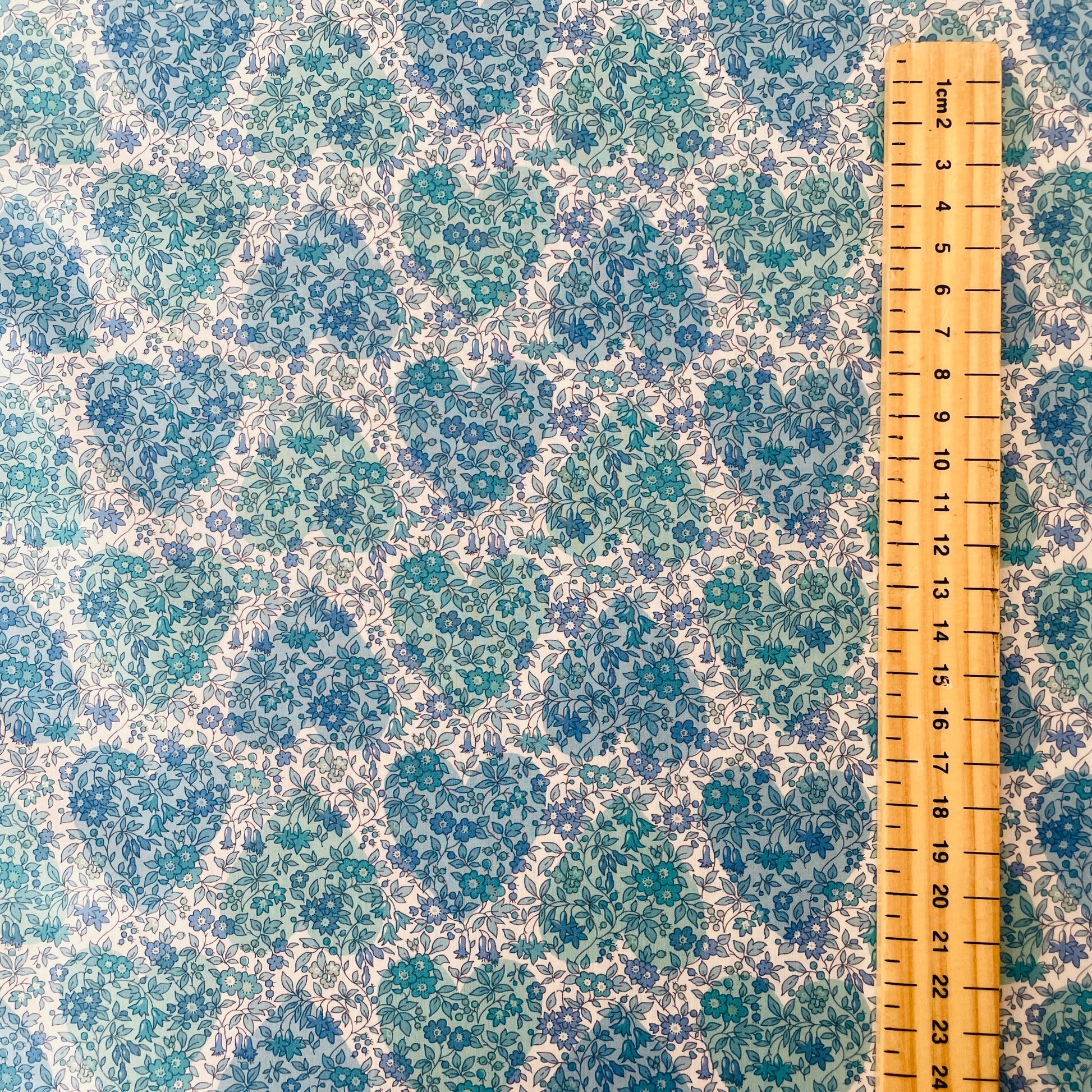 Using the beloved Chamomile print as a floral backdrop, this whimsical rendition introduces transparent, alternating hearts for a playful touch. Comprising of tiny berries and simplified trailing flowers including forget-me-nots, daisies, and bluebells, this quintessential Liberty botanical finds its roots in an archival 1950s pattern.