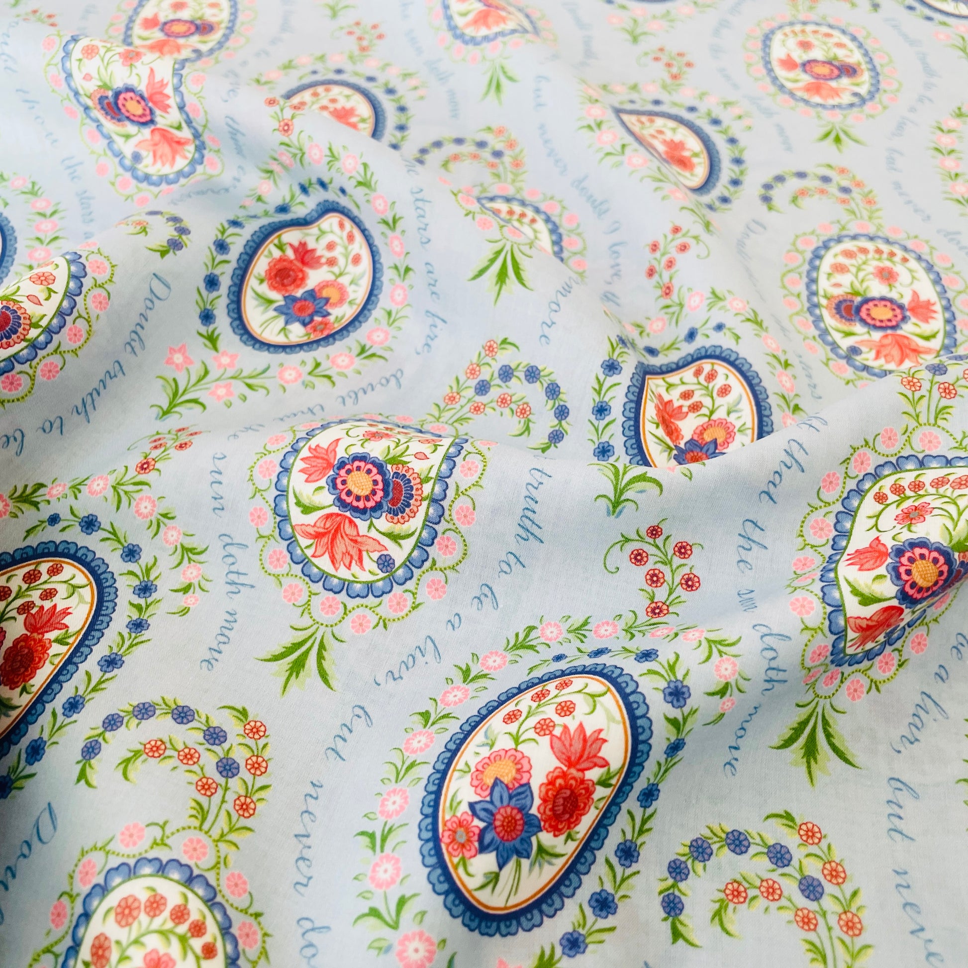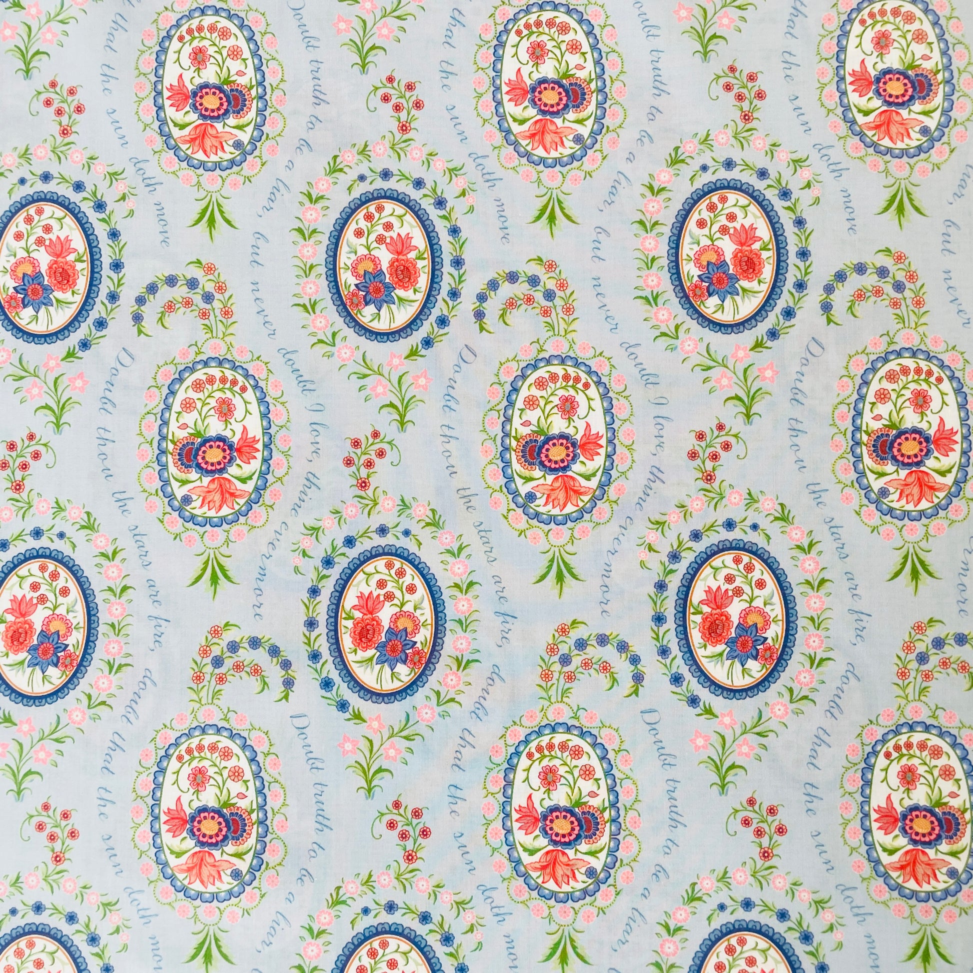 Love Poem draws inspiration from a miniature hand-painted artwork found within the pages of an archival pattern book dating back to the 1820s. Arranged in and around oval shaped botanical vignettes, its delicate blooms feature Persian-style flowers including tulips, chrysanthemums, and carnations. Take a closer look to discern the subtle words of a romantic love poem, gracefully woven amidst the elegant motifs.
