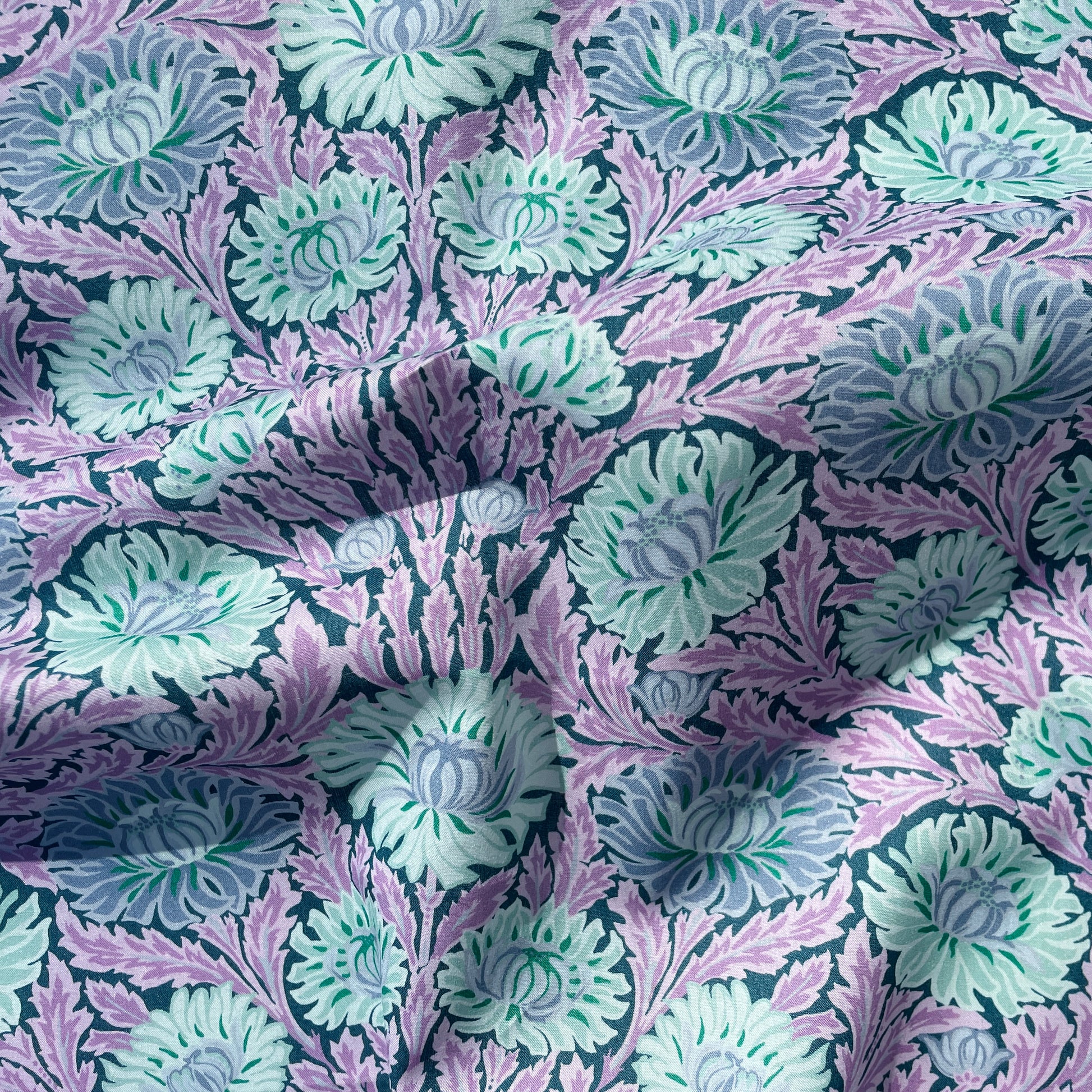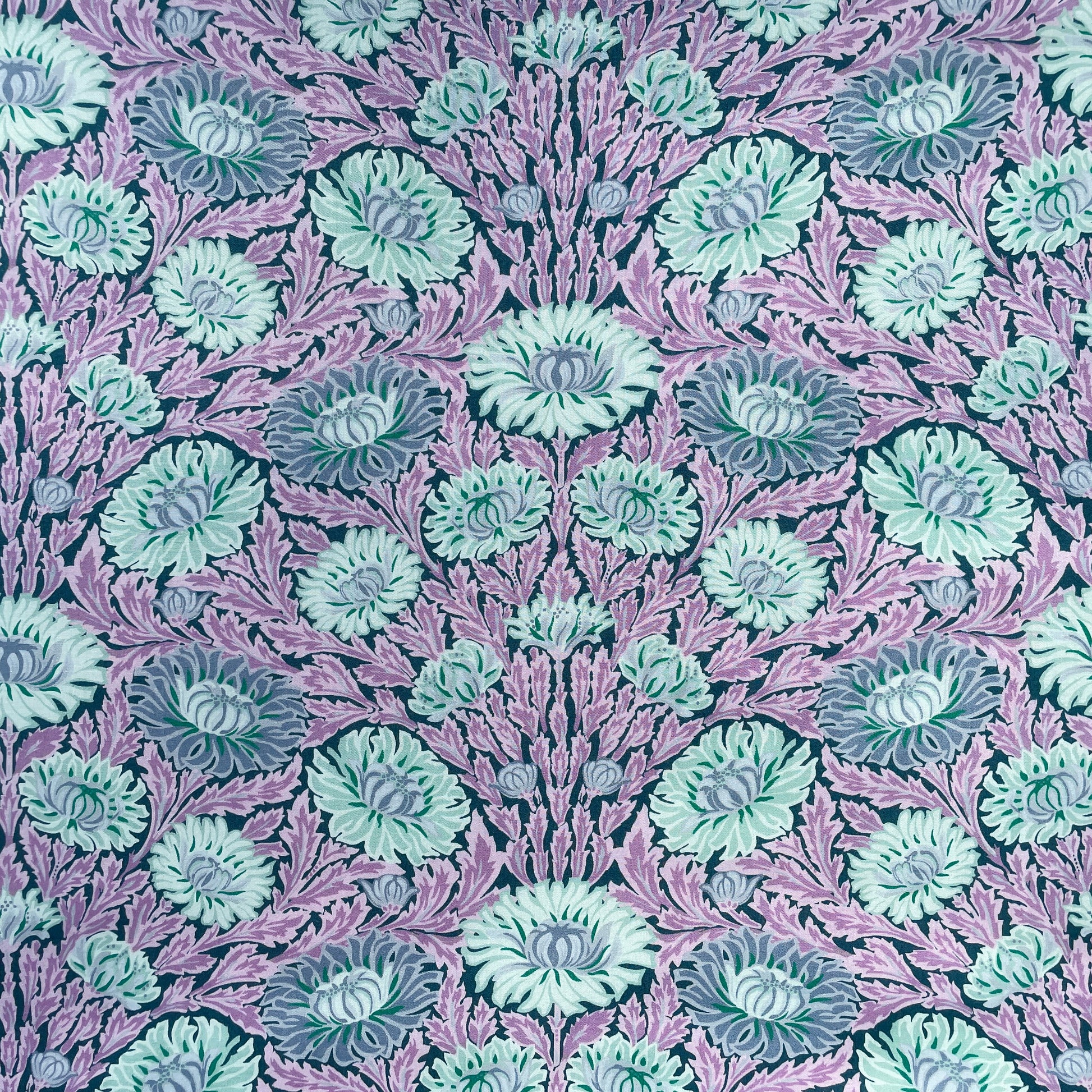 Created in 1991 in the style of an Art Nouveau floral, this luxurious pattern boasts a flourishing flow of synchronised chrysanthemums. Originally printed for Liberty as a furnishing fabric, Cynthia Nouveau has been reimagined into a richly hued botanical, exuding timeless sophistication and elegance.