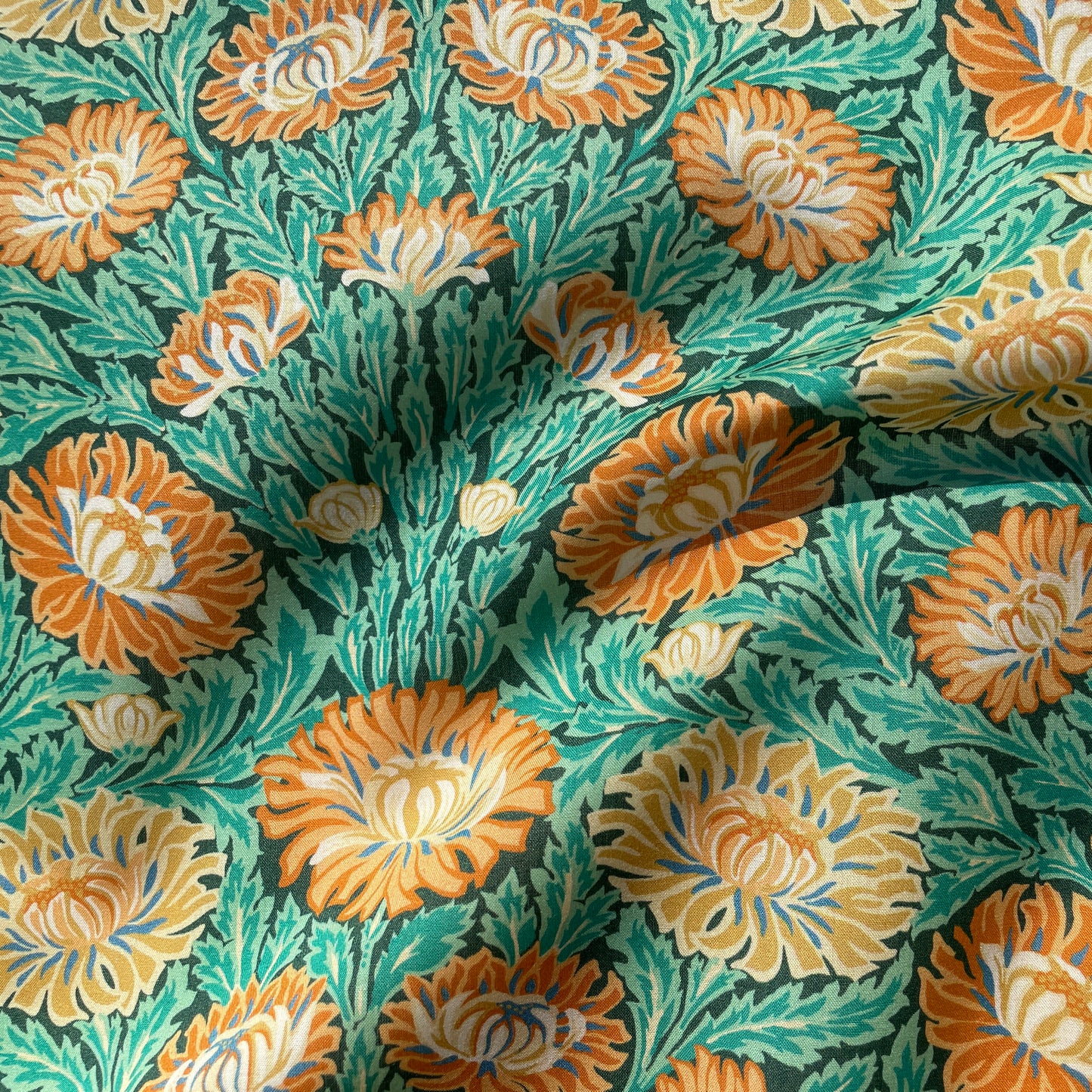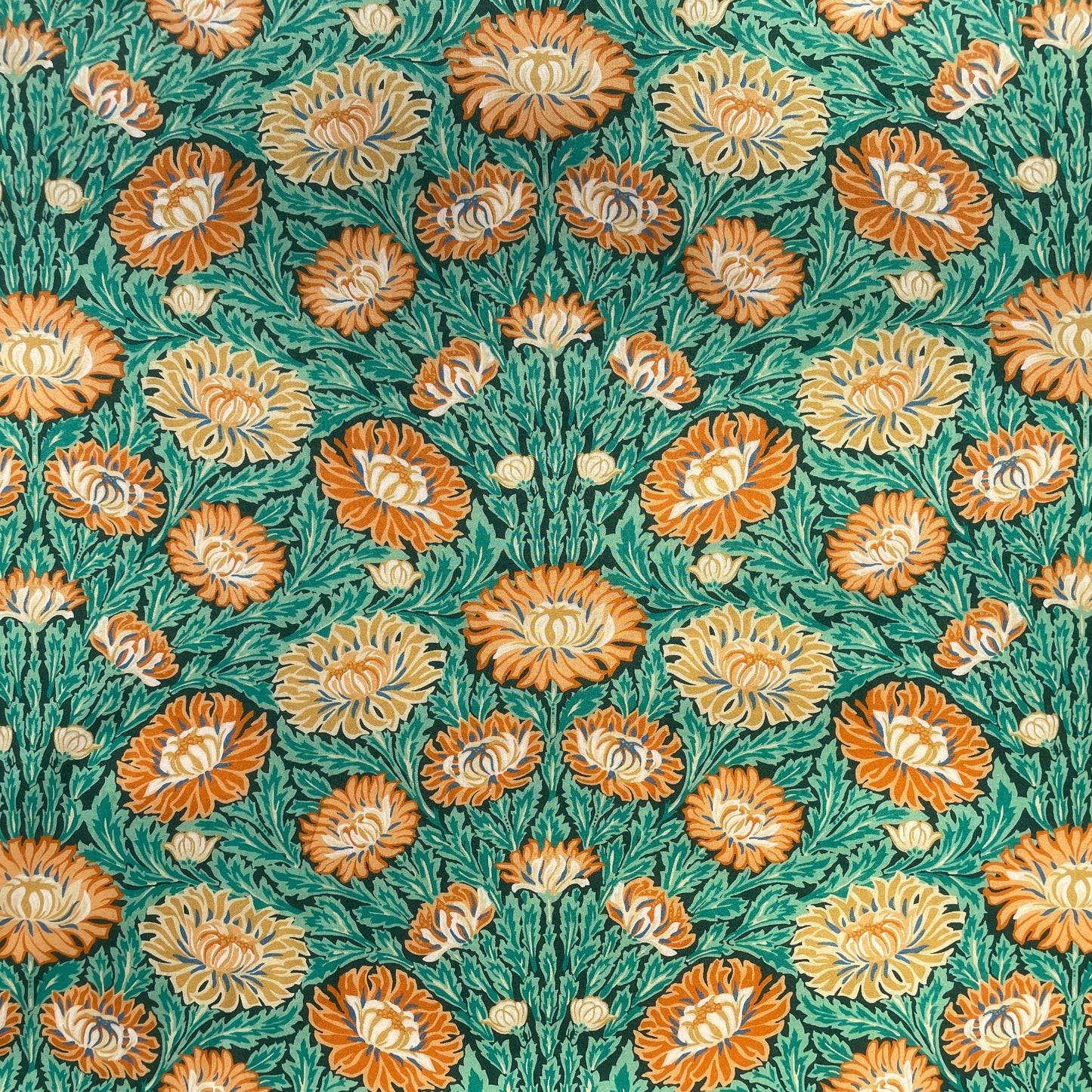 Created in 1991 in the style of an Art Nouveau floral, this luxurious pattern boasts a flourishing flow of synchronised chrysanthemums. Originally printed for Liberty as a furnishing fabric, Cynthia Nouveau has been reimagined into a richly hued botanical, exuding timeless sophistication and elegance.