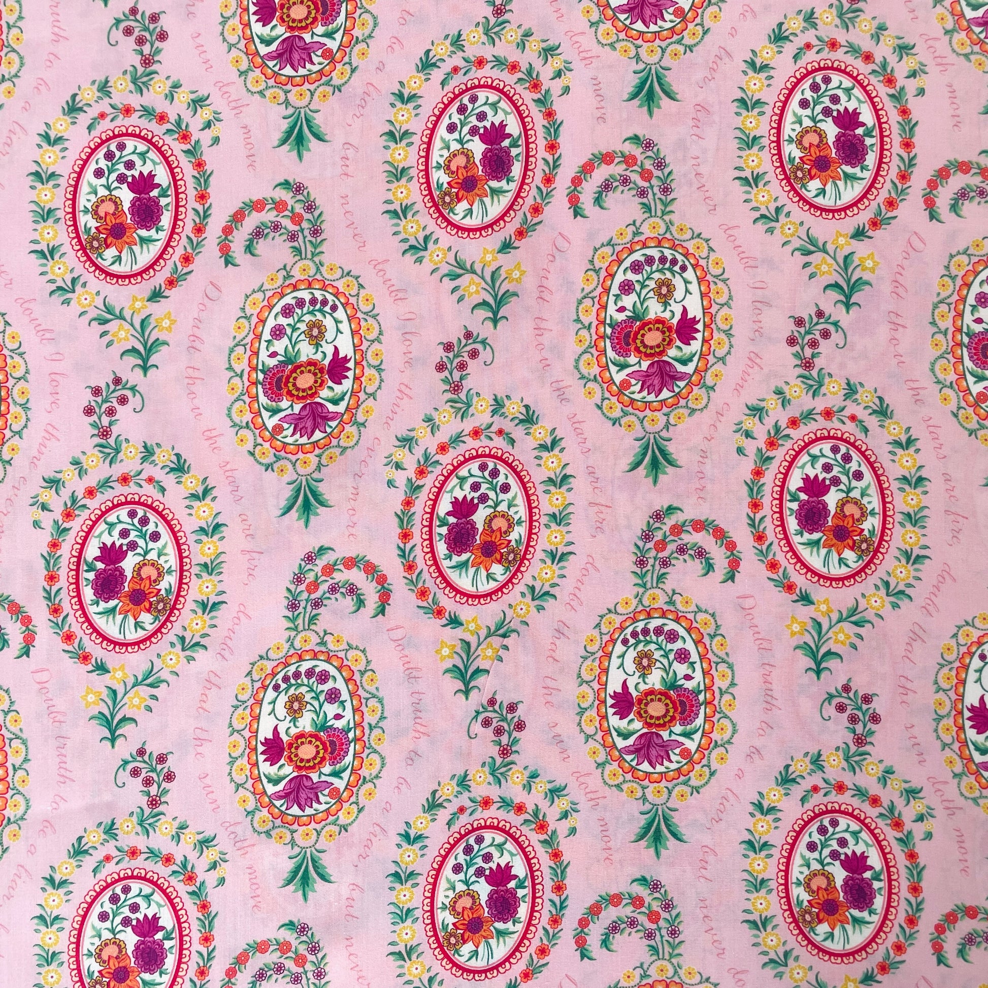 Love Poem draws inspiration from a miniature hand-painted artwork found within the pages of an archival pattern book dating back to the 1820s. Arranged in and around oval shaped botanical vignettes, its delicate blooms feature Persian-style flowers including tulips, chrysanthemums, and carnations. Take a closer look to discern the subtle words of a romantic love poem, gracefully woven amidst the elegant motifs.