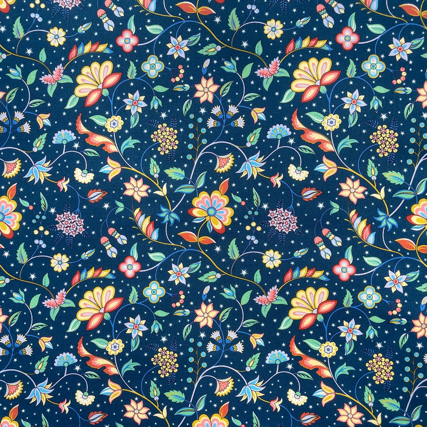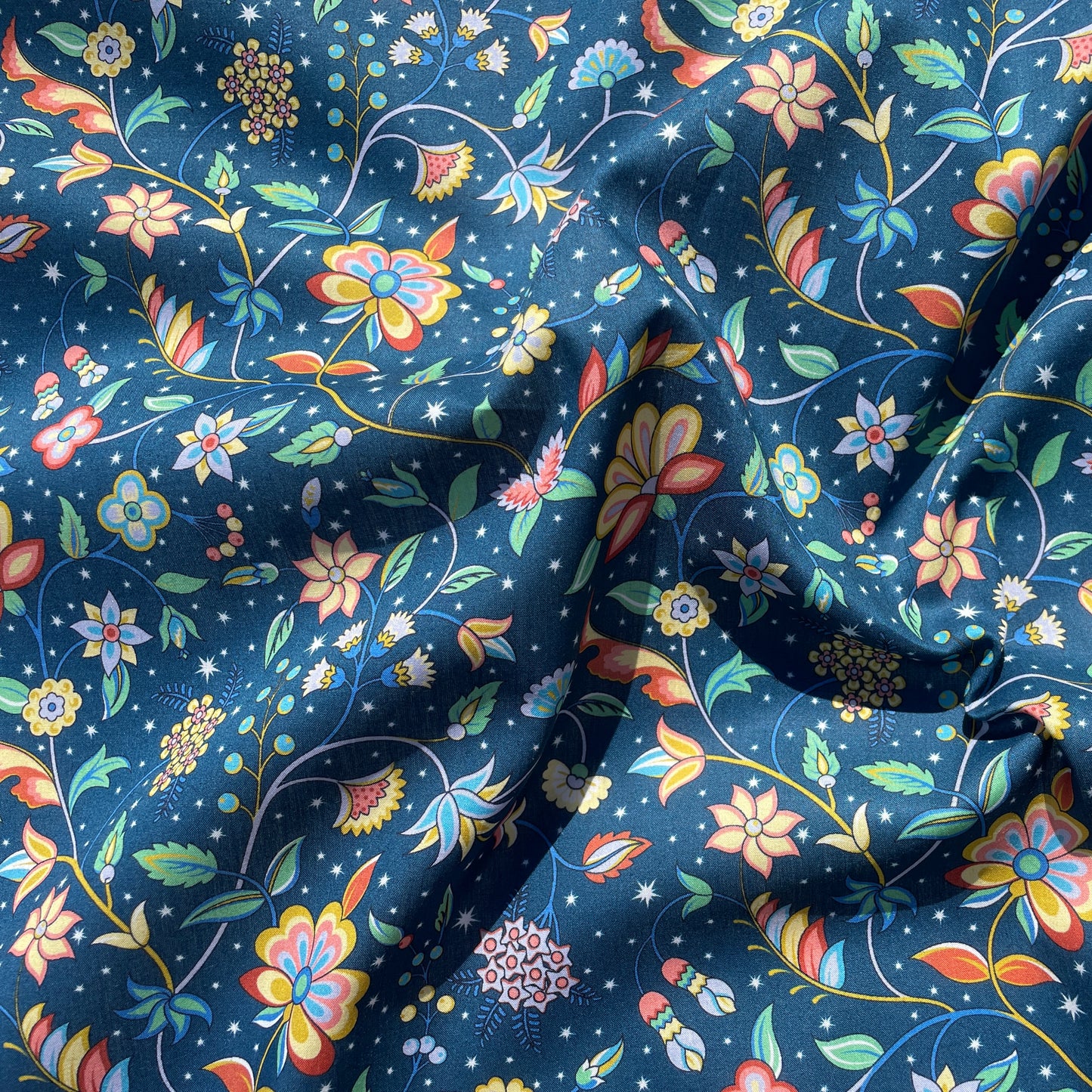Hand drawn in ink and painted using gouache in the Liberty studio, this design features a richly embellished floral vine, reminiscent of a traditional Tree of Life pattern. Stylised ornamental blooms and patterned leaves intertwine with blossoms, berries and buds, trailing across a star-studded night sky.