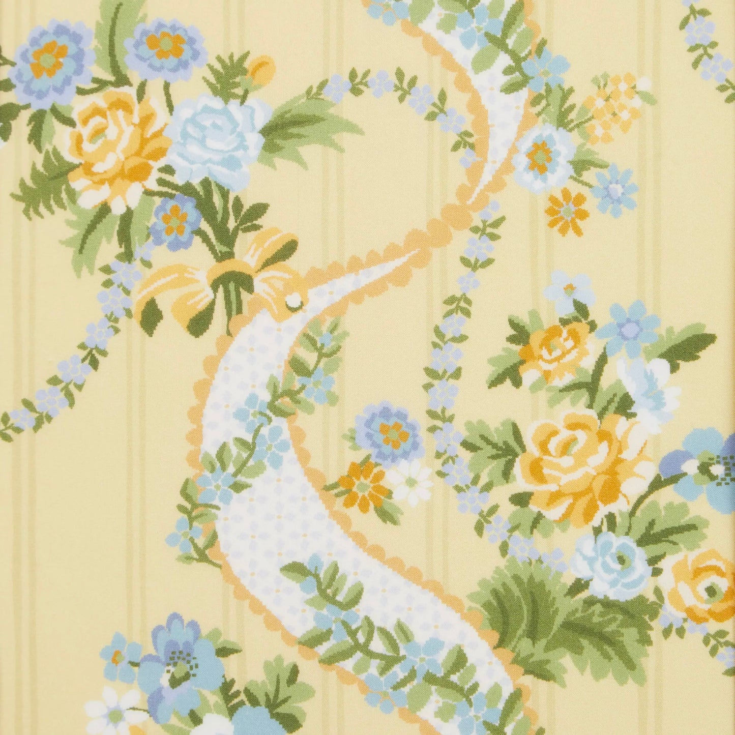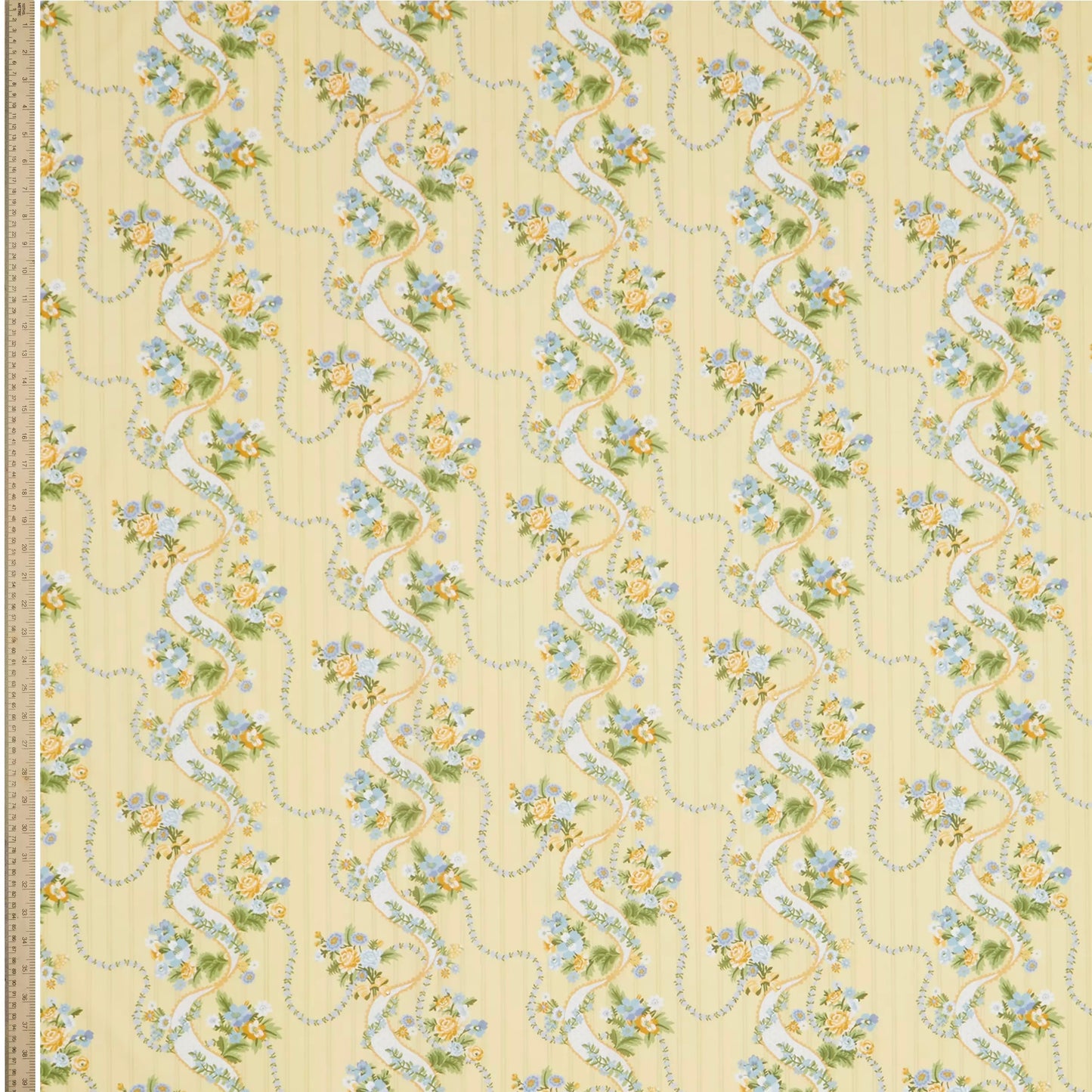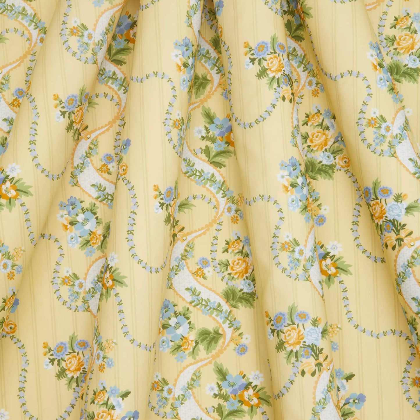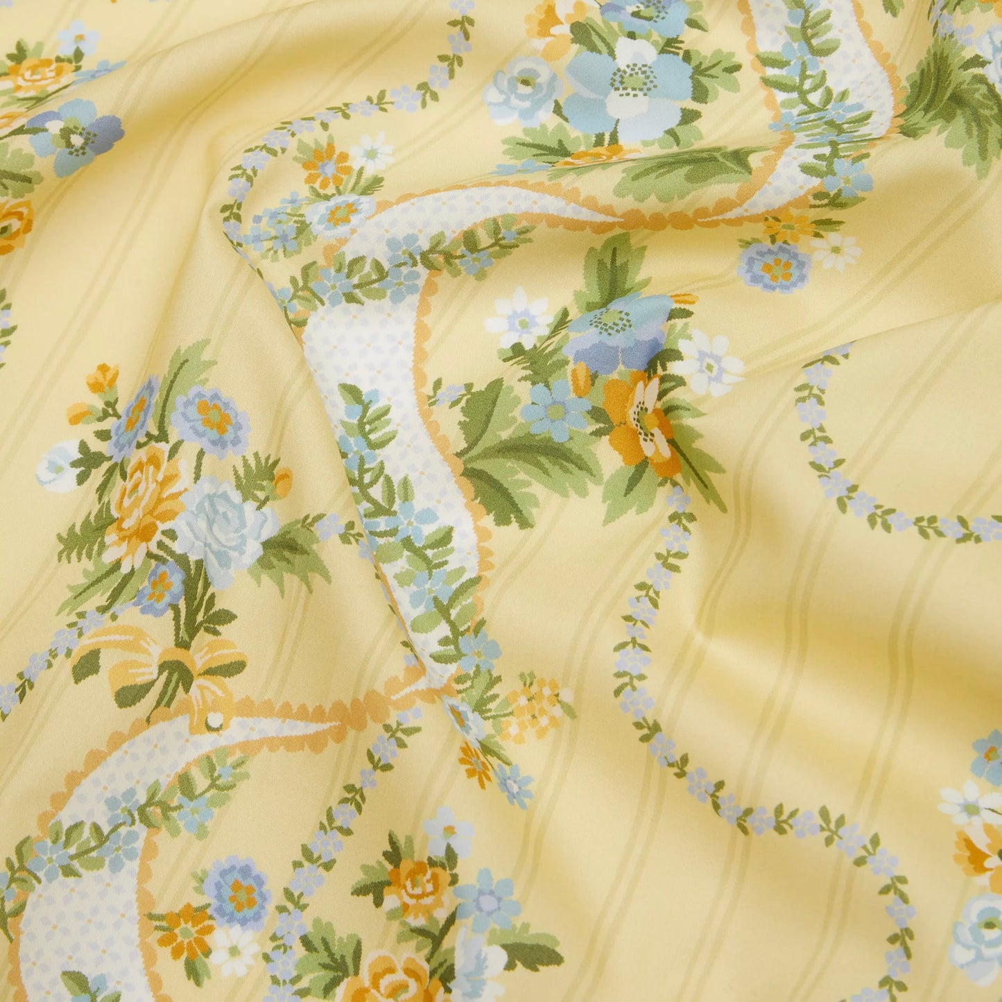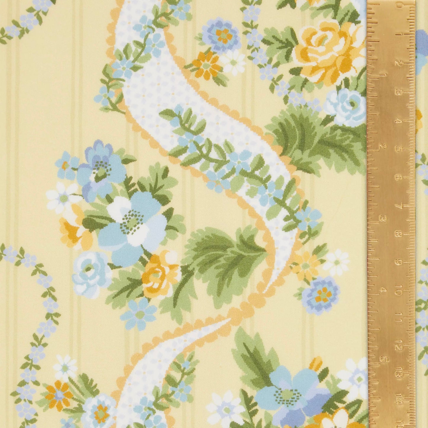 Inspired by a collection of 18th century hand-painted point papers from the Liberty archive, Ribbon Cascade exudes poetic allure and graceful fluidity. Nostalgic rose, poppy, and daisy bouquets peek through finely embroidered ribbons and cascading floral chains, enhanced by a palette of soft pastel hues. The design takes on an eclectic twist with the addition of a fine background stripe, exuding a sense of whimsy and sophistication. This print is part of the Regency Bouquet chapter of the Liberty Fabrics & Bridgerton collection - inspired by the lavish costumes, formal soirées, and lively garden parties depicted in the series, these vividly exuberant blooms are characterised by a sense of realism.