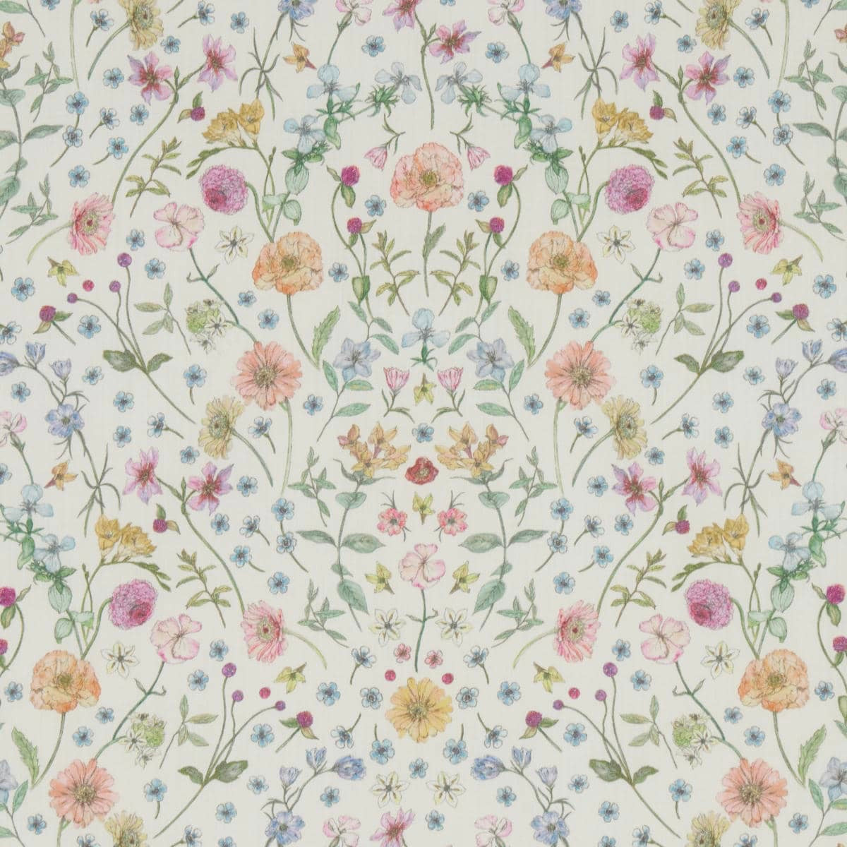 "Archway" celebrates the vibrant wildflowers of Europe, painted in pencil and traditional Japanese watercolors. Poppies, gerberas, scabiosa, delphiniums, amaranths, dianthus, gentians, anemones, and more are depicted in a delicate mirror-like layout, reflecting nature's complex dance between chaos and symmetry.