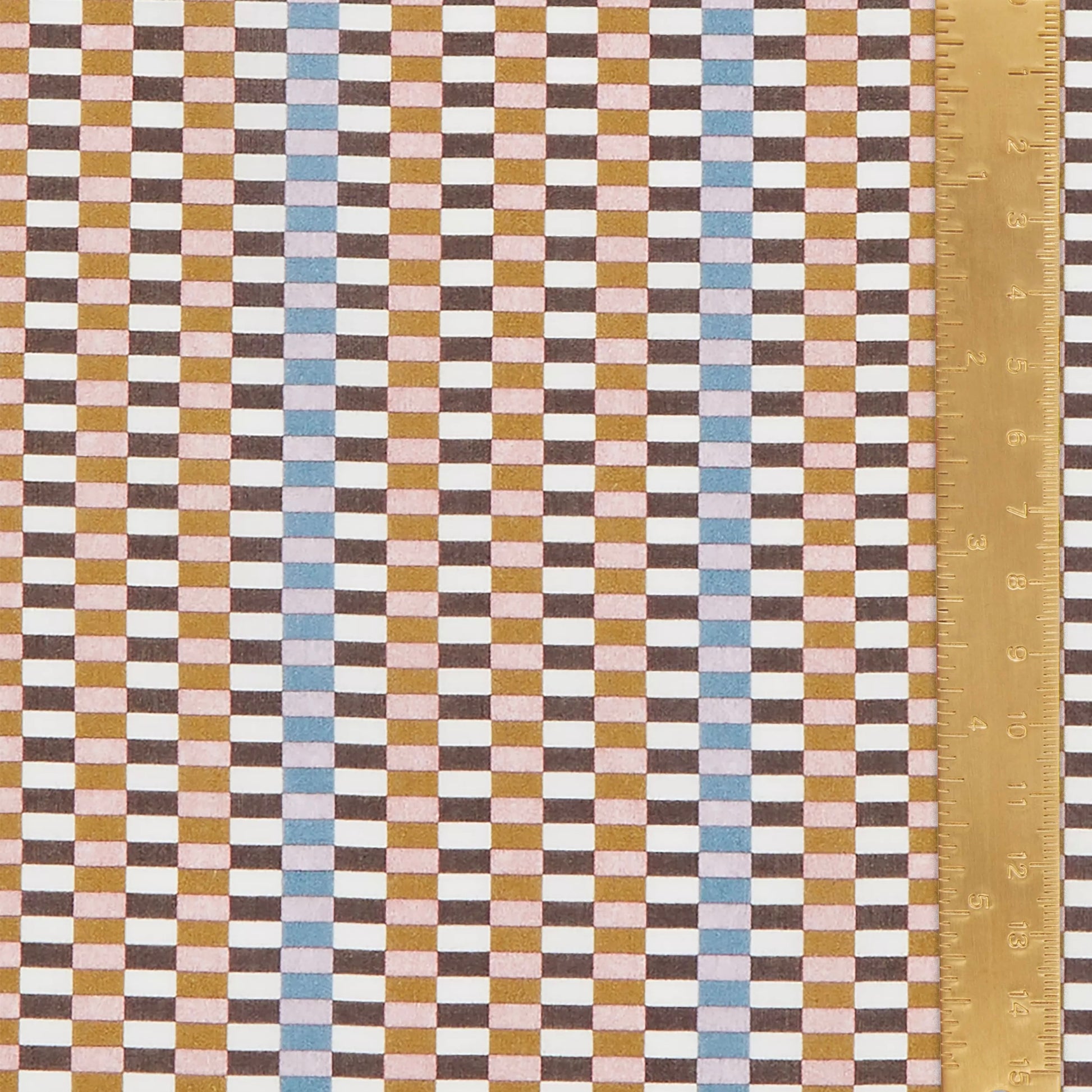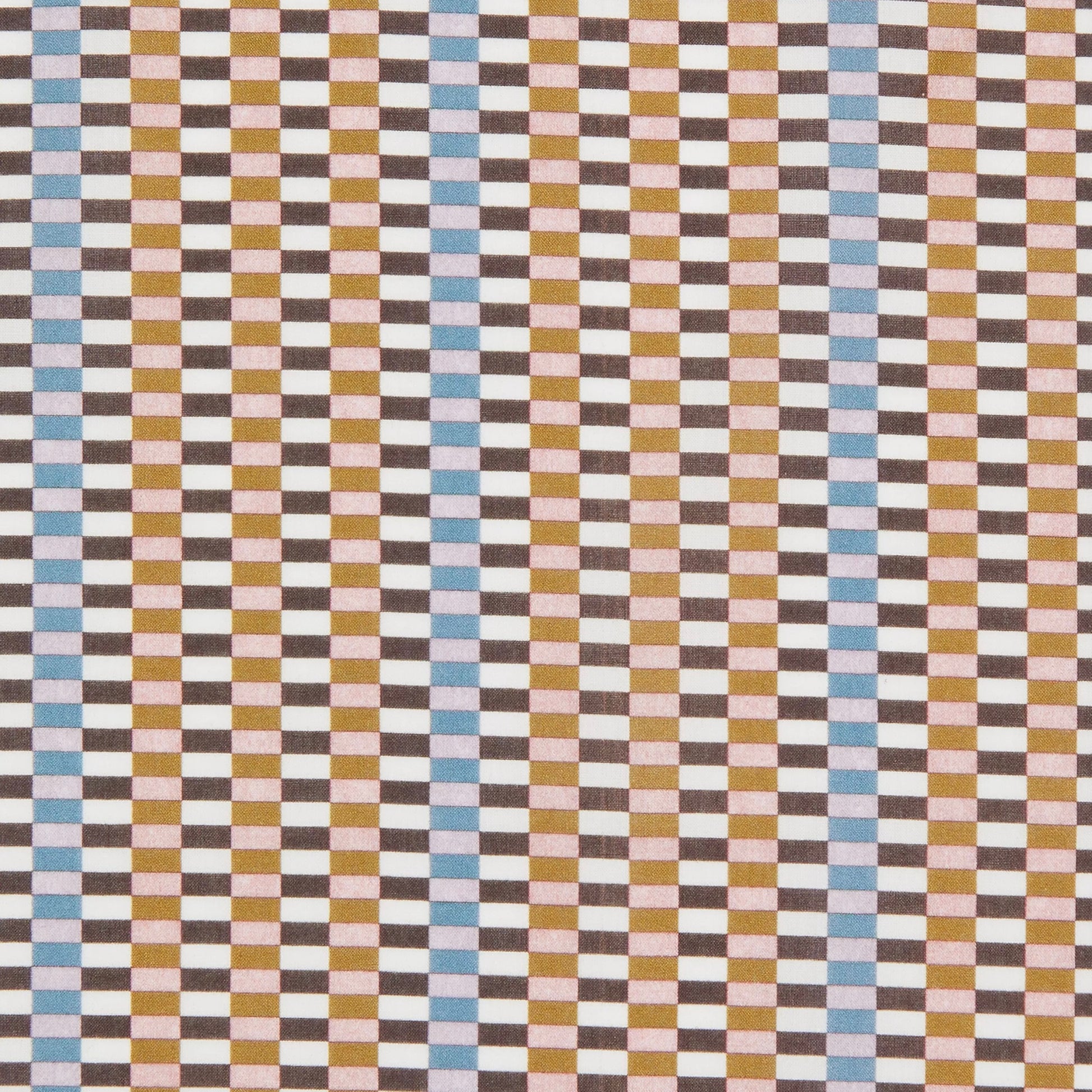 Designed in the Liberty studio, Rohan Kiaan is an ode to the wonderful craftsmanship of textiles. Inspired by educational silk weaving exhibitions held at the Liberty store during the 1880s, this mesmerising check pattern features alternating rows of small, rectangular blocks. Vibrant colour contrasts serve as conduits for tessellating movement, creating the effect of simple woven structures. This print is part of the Craftsmanship narrative of this collection, exploring the creative process from within the Liberty archive, from print impressions and embroidered studies, to ceramics, jewellery, and furniture. Uncover the origins of the designers’ musings through artworks inspired by their sketchbooks and prototypes.
