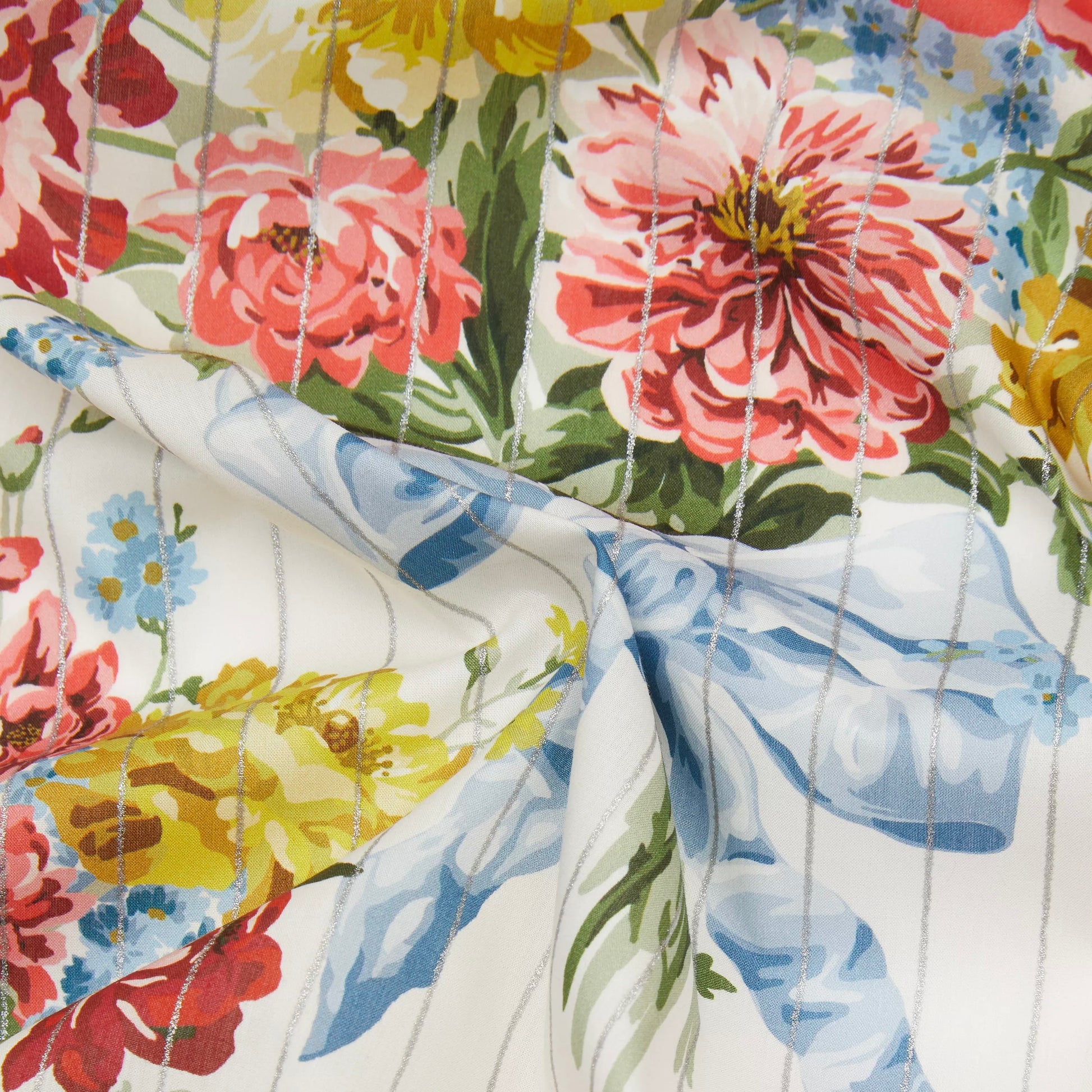 Assembled from an array of botanical prints unearthed in the Liberty archive, Bow Bouquet celebrates the kaleidoscope of colours and the splendour of nature’s beauty, boasting a symphony of opulent blooms. Echoing the grandeur of the Regency era, this theatrical pattern features roses, peonies, asters, lilacs, and larkspur, forming breath-taking bouquets delicately bound together with silk satin bows. Now reimagined with a dusting of silver polka dots and stripes, the design sparkles with enchanting radiance.